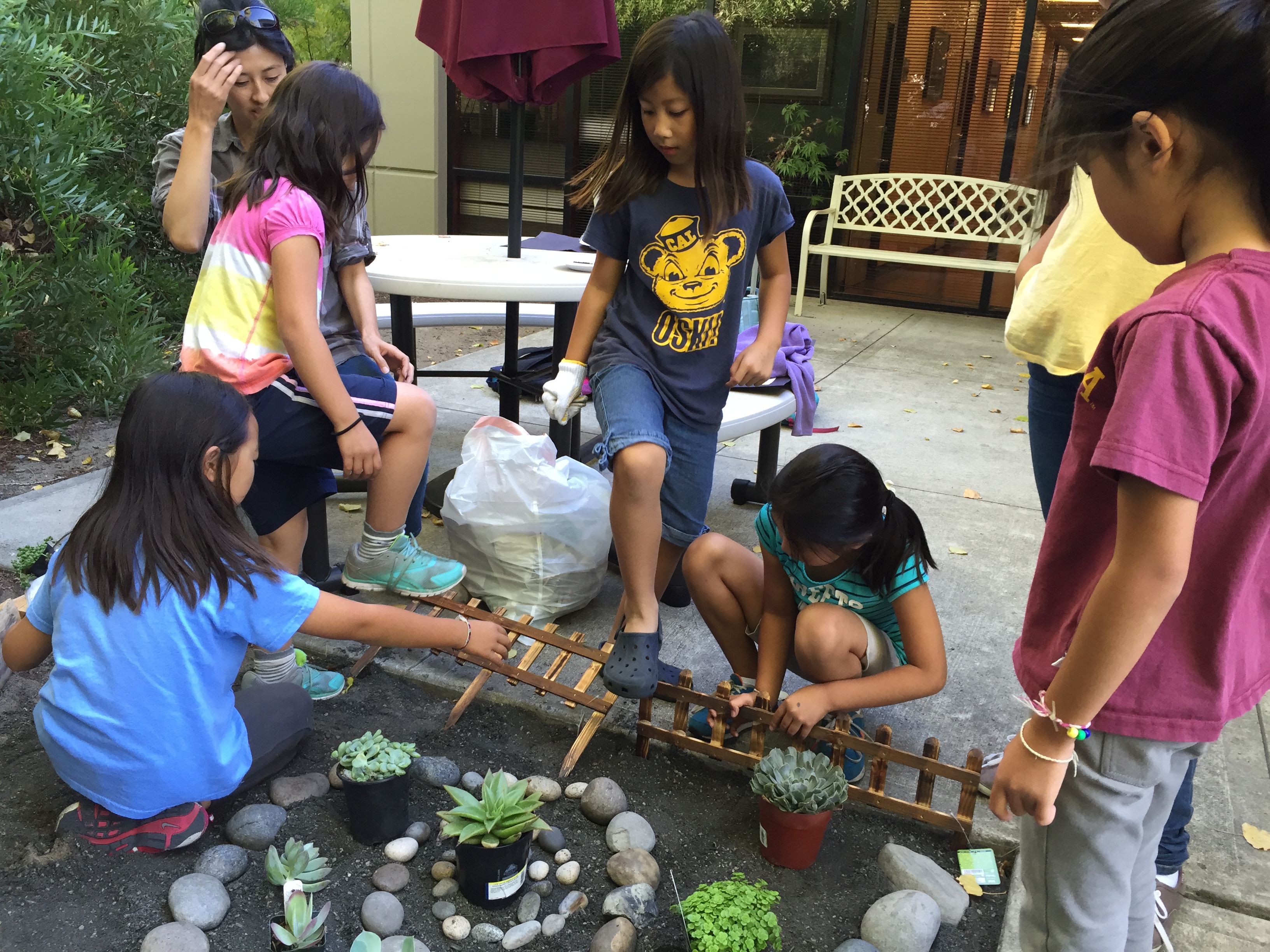 Some of you who aren’t physically at Gracepoint Berkeley church have requested more photos of Bibliopolis. Yesterday, Auntie Jenny and the 3rd grade girls (aka Kangaroos) converted a dirt patch into a lovely draught-friendly stone garden. It’s awesome seeing them take ownership and constantly thinking of ways to make our space more inviting!