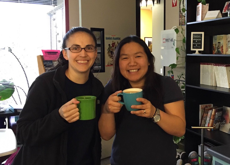 joyce and jessica bibliocafe Published February 26, 2016 at 800 × 575 in Introducing Bibliocafe Jessica & Joyce (people whose names don’t start with “J” can come to Bibliocafe too!) enjoying their drinks. That’s Joyce’s favorite cup, by the way.