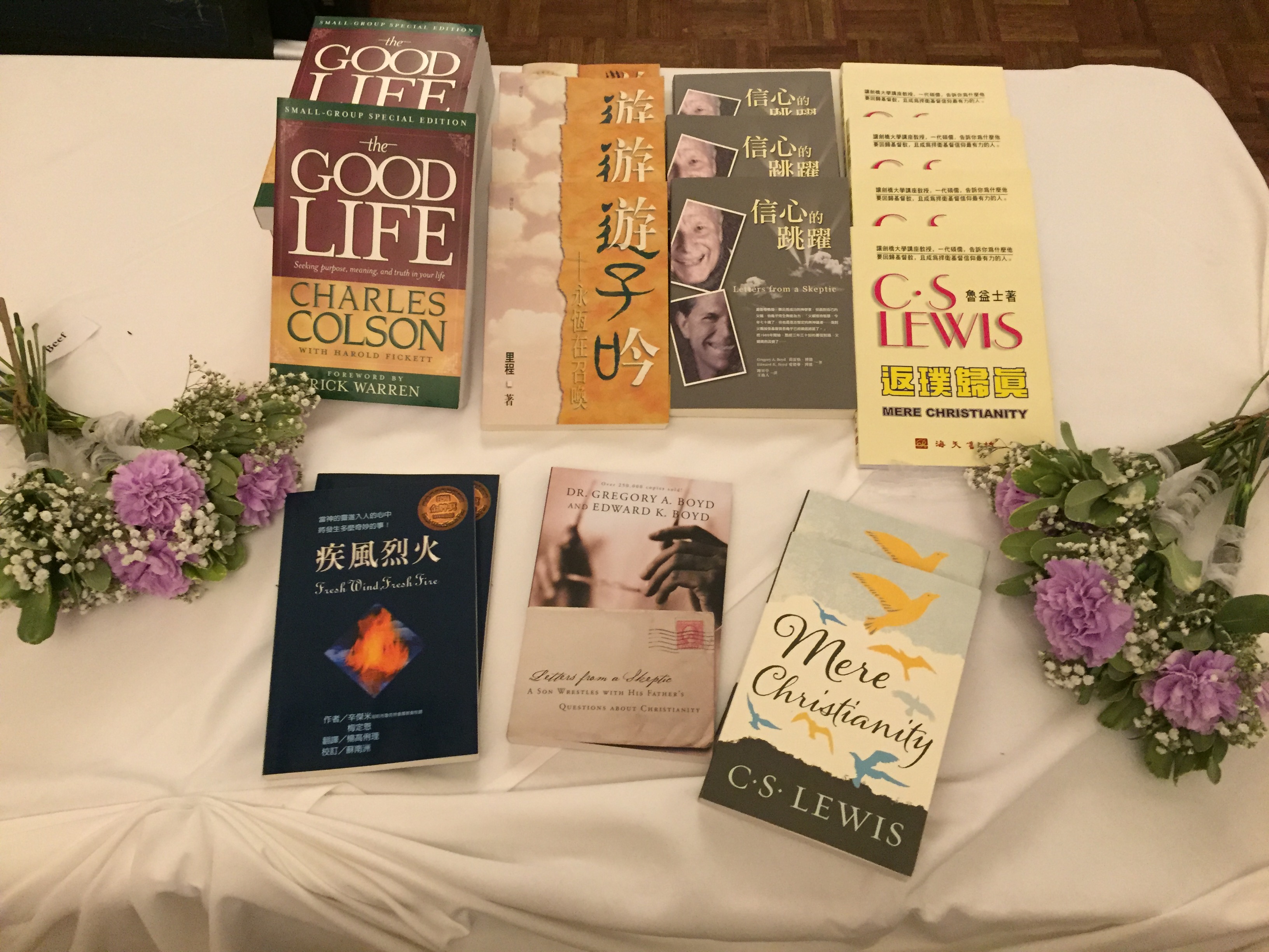 *Books pictured are as follows: The Good Life by Charles Colson, Mere Christianity by C. S. Lewis (one of the C.S. Lewis Five!), Letters From a Skeptic by Dr. Gregory Boyd, and Fresh Wind, Fresh Fire by Jim Cymbala.
